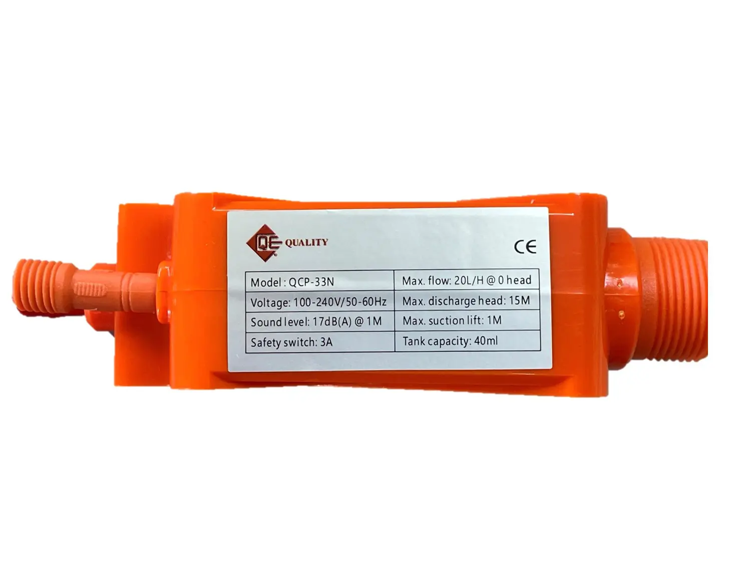 QE Quality Mini Condensate Pump, Model QCP-33N low noise control, compact modern design, suitable for all Air Conditions, Dual Voltage 100-230V / 50-60Hz, and Built-in Alarm Circuit.
